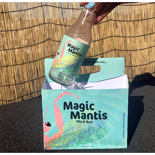 Magic Mantis is a Lychee and Blood Orange Pale Ale made with natural ingredients, right here in Sunny California. Our motto is "the real secret of magic lies in the craft." The concept of the design is to illustrate the principles of Scale and Dominance.